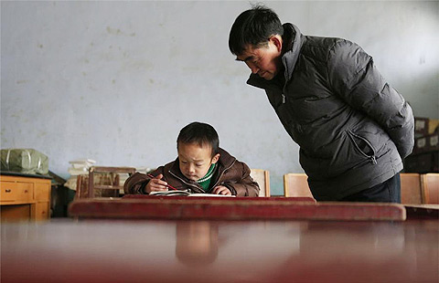 Zhao Guoqing teaches his only student, Wang Wenqiang, in Xuan'en county, Hubei province, March 24, 2014.