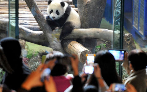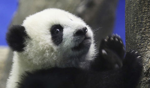 Yuan Zai, the first Taiwan-born baby panda, lies on wood logs inside an enclosure at the Taipei City Zoo in Taipei, January 4, 2014.
