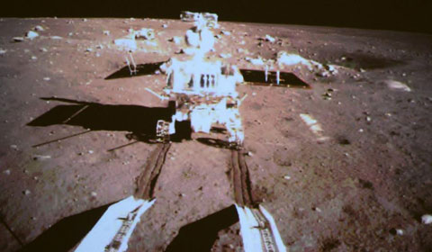 Screen shows the photo of the Yutu moon rover taken by the camera on the Chang'e-3 moon lander during the mutual-photograph process.