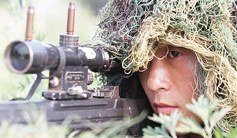 Soldiers crawl forward in the mud as icy water is poured onto their bodies from a fire truck. They then jump into a pool and are prevented from getting out by a man in a black mask who kicks their faces or shoulders. Explosions constantly ring out nearby.