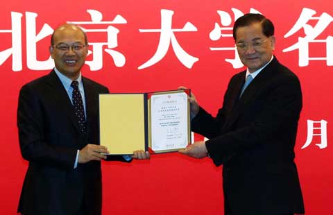 President of Peking University Wang Enge, left, awards the title of Honorary Professor at Peking University to Lien Chan, honorary chairman of Kuomintang (KMT), in Beijing, China, Feb 19, 2014.