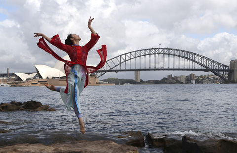Ballet star Zhang Yashu demonstrates her art on Monday in front of the Opera House and Harbour Bridge in Sydney, Australia.
