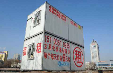 Containers used for living places at the demolition sites in Taiyuan, Shanxi province, Feb 19, 2014.