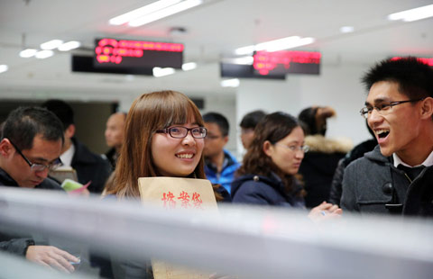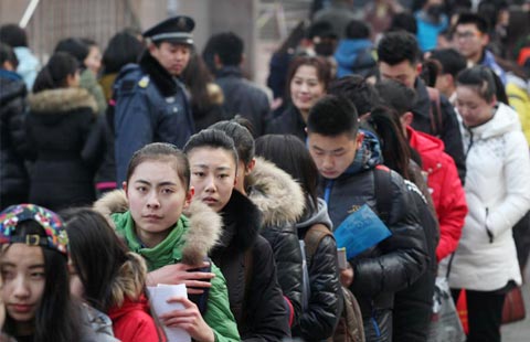 Prospective students wait to take the entrance test for the Beijing Film Academy in Beijing on Feb 9, 2014. About 513 of the 18,000 applicants will be selected by the college this year.