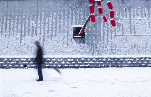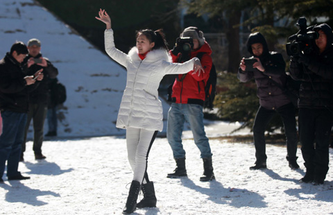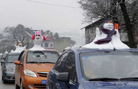 Two men make a couple snowmen on a customer's car in Longquan Mountain, in the suburbs of Chengdu, Southwest China's Sichuan province, Feb 10, 2014.