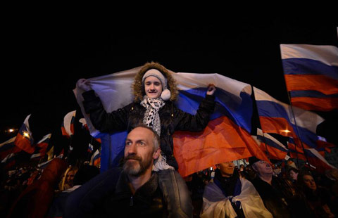 People celebrate the announcement of preliminary results of today's referendum in the Crimean city of Sevastopol March 16, 2014.