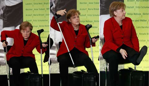 German Chancellor Angela Merkel stands with the aid of crutches as she meets carols singers (Sternsinger) during a reception at the Chancellery in Berlin, Jan 7, 2014.