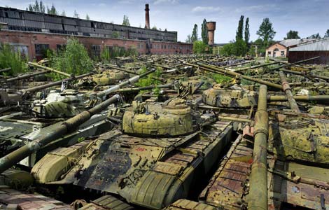 Filled with rows upon rows of rusted relics, the once deadly war machines now lie dormant in a little known location.