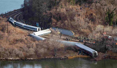 At least four people were killed and 63 injured early on Sunday when a passenger train derailed in New York City as at least five cars from a Metro-North train slid off the tracks, officials said.