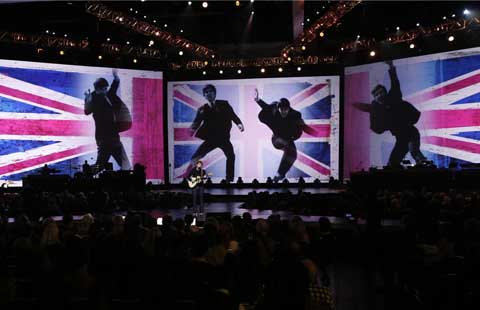 Paul McCartney (L) and Ringo Starr perform during the taping of "The Night That Changed America: A GRAMMY Salute To The Beatles", which commemorates the 50th anniversary of The Beatles appearance on the Ed Sullivan Show, in Los Angeles.