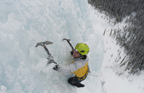 Ice climber Calixte LeBlanc climbs a frozen waterfall called the "Weeping Wall", captured in the Rocky Mountains area of Alberta, Canada.