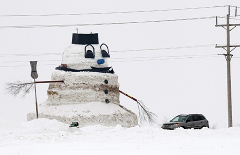 Sightseers photograph themselves in front of a 50-foot snowman named "Granddaddy" in Gilman, Minnesota, March 6, 2014.