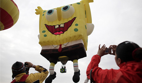Visitors take pictures of a hot-air balloon in the shape of SpongeBob SquarePants during the 12th International Hot-Air Balloon Festival at the Metropolitano park in Leon, in the Mexican state of Guanajuato.