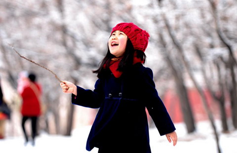 A girl enjoys snow fun at the Zhaoling Tomb in Shenyang, capital of Northeast China's Liaoning province, March 4, 2014.