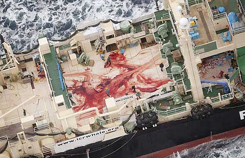 Japanese whaling ship Yushin Maru (C) prevents the Sea Shepherd vessel, the 'Bob Barker' (foreground), from closing in on fellow whaling vessel Nisshin Maru (background) in the Southern Ocean