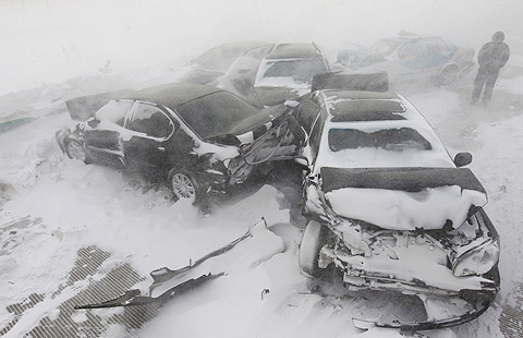 Dozens of vehicles were damaged in a massive pileup on an expressway amid a snowstorm in Northwest China's Heilongjiang province Feb 2, 2014. [Photo/icpress]