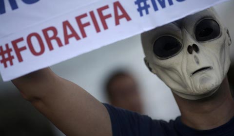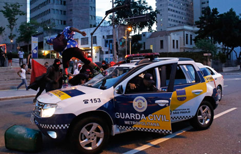 Demonstrators run through a bar after clashing with military police during a protest against the 2014 World Cup in Sao Paulo Jan 25, 2014.