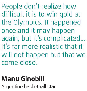 "People don't realize how difficult it is to win gold at the Olympics," Ginobili told the website of FIBA, world basketball's governing body. "It happened once and it may happen again, but it's complicatedIt's far more realistic that it will not happen but that we come close."