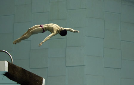 Chinese diver Huo Liang trains with the national team in Jinan of east China February 28, 2007. The team has announced the roster for the coming World Swimming Championships in March in Melbourne of Canada. [Xinhua]
