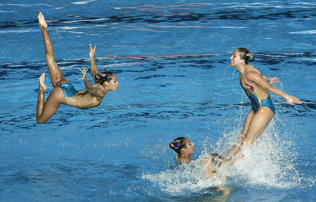 Members of the Mexican team perform during the synchronised swimming free combination routine final at the World Aquatics Championships at Rod Laver Arena in Melbourne March 18, 2007. [Reuters] |