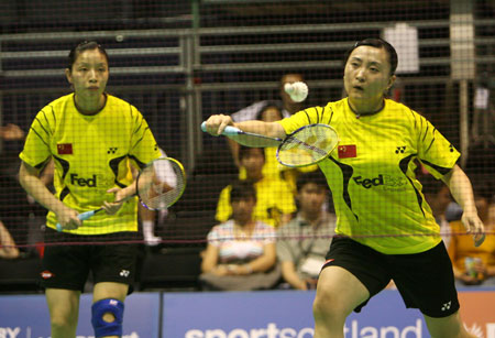 China's Yang Wei (L) and Zhao Tingting return a shot to Thailand's Duanganong Aroonkesorn/ Kunchala Voravichitchaikul during their women's doubles game of the first round match of Sudirman Cup Badminton Tournament in Glasgow of England June 12, 2007. Defending China swept a 5-0 win. [Xinhua]