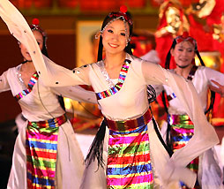 Performers hold banners during the one-year countdown celebrations for the 29th Olympic Games in Tiananmen Square in Beijing August 8, 2007.[Reuters]