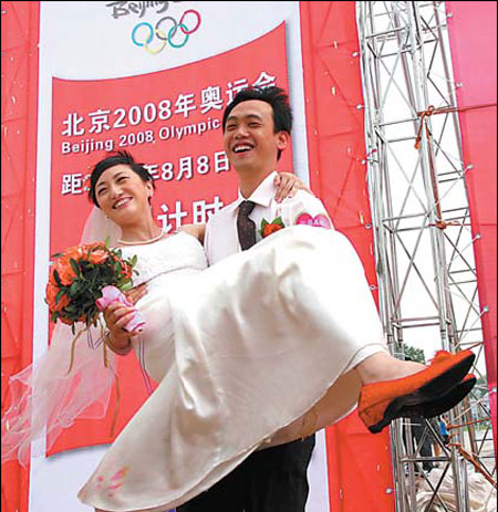 A newly married couple pose for a photograph in front of a countdown clock to the Beijing Olympics in Shenyang, capital of Northeast China's Liaoning Province, yesterday. More than 50 couples tied the knot yesterday to mark the one-year countdown.