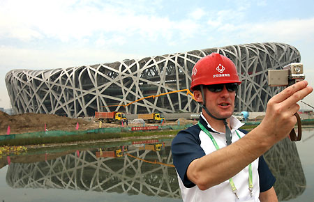 An overseas reporter takes a picture of himself in front of the construction site of the National Olympic Stadium, also known as the Bird's Nest, September 10, 2007. The accreditation process for the 2008 Beijing Olympic Games by the Beijing Organizing Committee for the Games of the XXIX Olympiad (BOCOG) has begun and the deadline for the return of forms is February 29, organizers said. [Xinhua] |