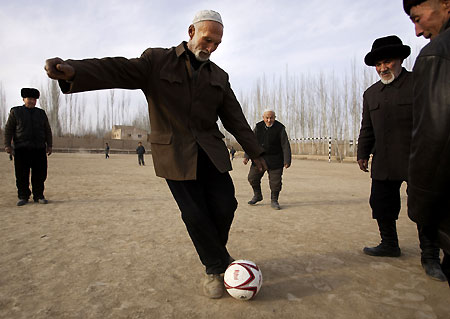 An senior villager from North China's Xinjiang Uygur Autonomous Region shoots the ball during a training session December 26, 2007. The village has fielded a football team for senior men aged from 50 to 88, who do on-court workouts three times a week in the village's school yard. [Xinhua]