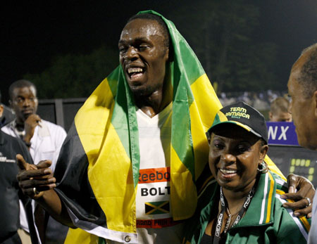 Usain Bolt (L) of Jamaica celebrates with Jamaica's Minister of Sport Olivia Grange after setting a new world record in the men's 100 meters race next at the Reebok Grand Prix athletics meet in New York May 31, 2008. Bolt ran a time of 9.72 seconds in the race. [Agencies]