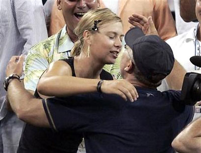 Russia's Maria Sharapova (L) hugs her father Yuri Sharapov after her win over Belgium's Justine Henin-Hardenne in the women's final match at the U.S. Open tennis tournament in New York, in this September 9, 2006 file photo. [Agencies]