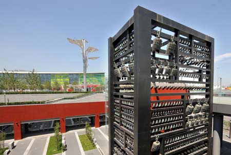Photo taken on July 6, 2008 shows chimes, a kind of traditional Chinese instrument, at the man-made sinkage square in the Olympic Forest Park in Beijing, capital of China. [Xinhua]
