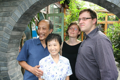 Host and hostess of the courtyard Jing Jichang (L1) and his wife Wang Zhixi(L2) pose with Berlin visitors Peter Voigt(R1) and his girlfriend Simone Teuber (R2) on July 30, 2008. [CRIENGLISH.com]