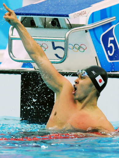 Japan's Kosuke Kitajima celebrates victory as he claims the title of the men's 100m breaststroke swimming at the National Aquatics Center in the 2008 Beijing Olympic Games on August 11, 2008. Kitajima, defending the title he won in Athens four years ago, broke the previous record of 59.13 set by US swimmer Brendan Hansen at Irvine, California, on August 1, 2006. [Agencies]