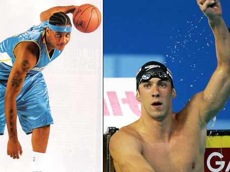 A file photo shows Carmelo Anthony and Michael Phelps.[sohu.com]