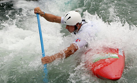 Michal Martikan of Slovakia competes in the 2008 Beijing Olympic Games Mens's singles C1 slalom heats event at the ShunyiRowingand Canoeing Park in Beijing on August 11, 2008. [Agencies]