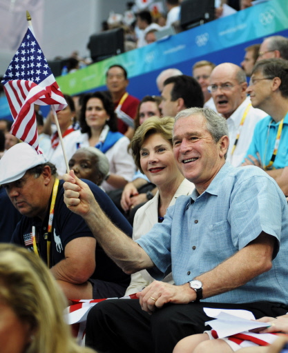 US President George W. Bush (R) waves a US flag as he and First Lady Laura Bush watch the 2008 Beijing Olympic Games men's 200m freestyle semi-finals with swimmer Michael Phelps at the National Aquatics Center in Beijing on August 11, 2008. [Agencies]