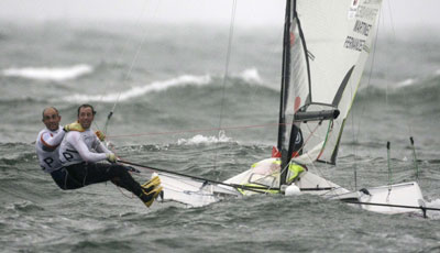 Iker Martinez de Lizarduy and Xabier Fernandez of Spain, sailing in the 49er class, react during the medal race at the Beijing 2008 Olympic Games in Qingdao, Shandong province, August 17, 2008.[Agencies]