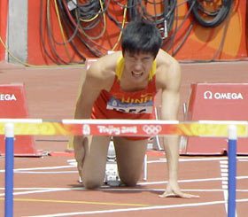 Liu Xiang grimaces in pain as he settles into the starting block of his 110m hurdles heat of the athletics competition at the Beijing Olympic Games in this August 18, 2008 file photo. [Agencies]