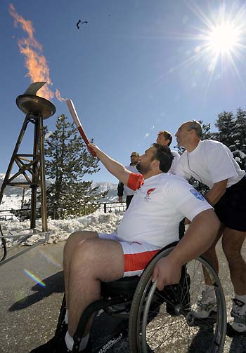 The first torchbearer in Metsovon (in wheelchair) lights the Olympic flame to start the relay in the city of Greece on March 26, 2008. The Olympic flame relay in Greece entered third day. [Xinhua]