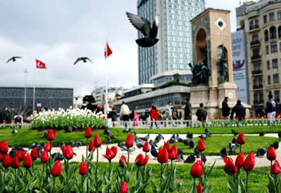 Red tulips are seen in Istanbul's square in this March 30, 2008 photo. This Turkey's largest city of Istanbul, the second stop of the global torch relay. [Xinhua]