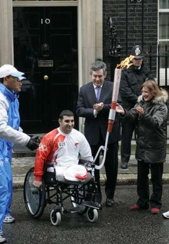 Britain's Prime Minister Gordon Brown (2nd R) claps as the Olympic flame is carried by disabled athlete Ali Jawad alongside Minister of Olympics Tessa Jowell (R) outside 10 Downing Street in London April 6, 2008. [Agencies]