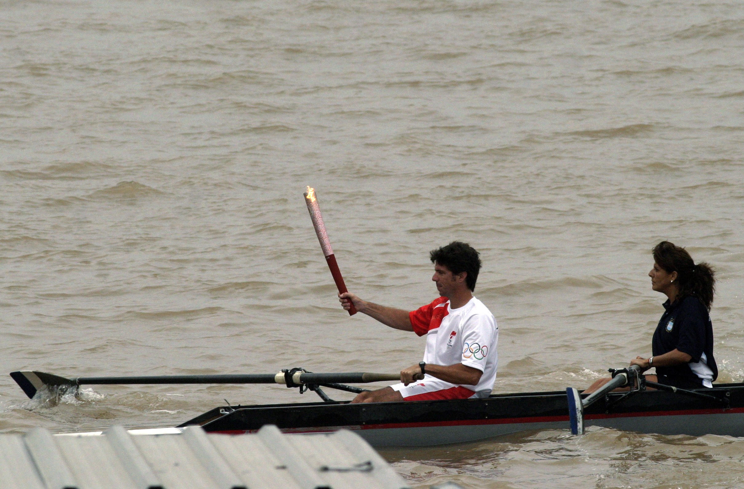 The Olympic torch is carried by rower Santiago Hernandez in the River Plate as it continues its relay through Buenos Aires April 11, 2008. [Agencies]
