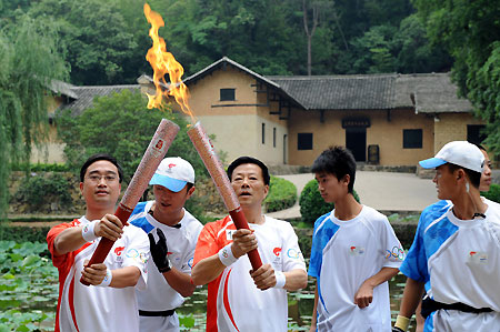 Torchbearers pass the Beijing Olympic flame in front of the residence of late Chairman Mao Zedong during the torch relay in Xiangtan, Central China's Hunan Province, June 5, 2008. [Xinhua]