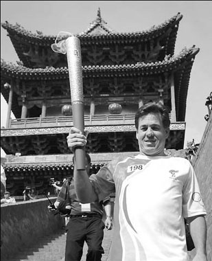 PINGYAO, Shanxi - Jeff Morgan, an urban planner from the United States, climbed down from the 600-year-old city walls of Pingyao to roaring cheers and to the beat of drums, holding aloft the Olympic torch on Wednesday.