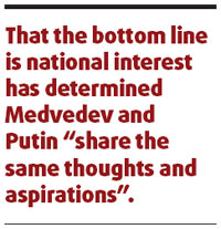 That the bottom line is national interest has determined Medvedev and Putin "share the same thoughts and aspirations".