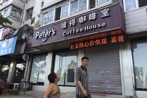 ![]() A boy looks up as he walks past the closed coffee shop owned by Canadian couple Kevin Garratt and Julia Dawn Garratt in Dandong, Liaoning province, August 5, 2014.[Photo/Agencies] |