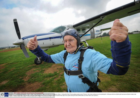 | Peter Proctor getting ready to jump 92-year-old former Spitfire pilot becomes Britain's oldest male skydiver from height of 12,000ft, Cambridgeshire, Britain Sept 3, 2014. [Photo/IC] |