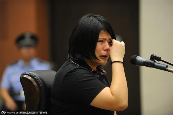 Le Yan weeps during her trial on charges of starving her two young daughters to death in a court in Nanjing, Jiangsu province, September 18. [Photo/CFP] |
