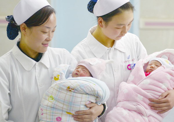 Obstetric nurses in the Central Hospital of Enshi, Hubei province, take care of newborns at the hospital. Couples in Enshi are allowed to have two children. Li Yuanyuan / for China Daily |